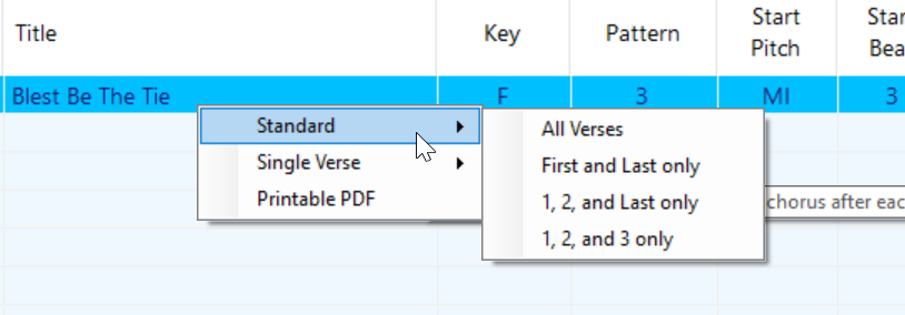 - Right-clicking on the songs gives various presets for the song (all verses, first and last verse, etc)
